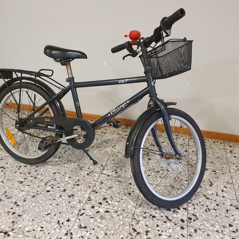 barncykel med 20" hjul i blå färg. Utrustad med pakethållare bak, kedjeskydd, reflexer och handbroms fram. Passar barn som behöver en cykel i 20-tumsstorlek för vardagscykling och fritidsbruk.