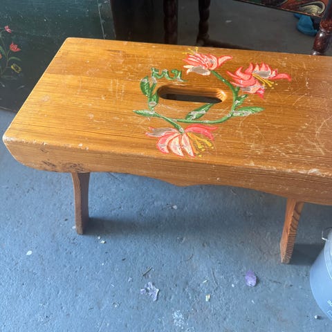 Träet är redan slipat och förberett för att målas i valfri färg. Sitsen är i originalt läder med klädsamt slitage. Använd den som den är med vintage-karaktär eller klä om den med tyg (se inspirationsbild).