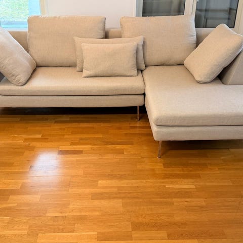 Soffan har en schäslong som ger extra komfort för avkoppling.