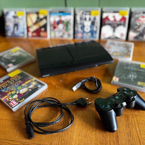 Sony Playstation 3 spelkonsol svart med två handkontroller och spel