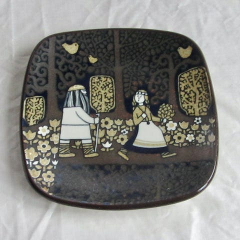 Skrinets mått 8,5 x 7,2 cm, höjd med lock 3,5 cm. Äggen längd 3,7 cm.