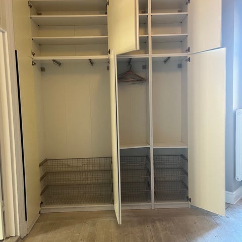 Säljer en monterad garderob i mycket bra skick. Minns ej vart den kommer från. Skulle inte rekommendera att montera ned den, utan transport som en hel möbel är att rekommendera. Mått kan skickas vid intresse.