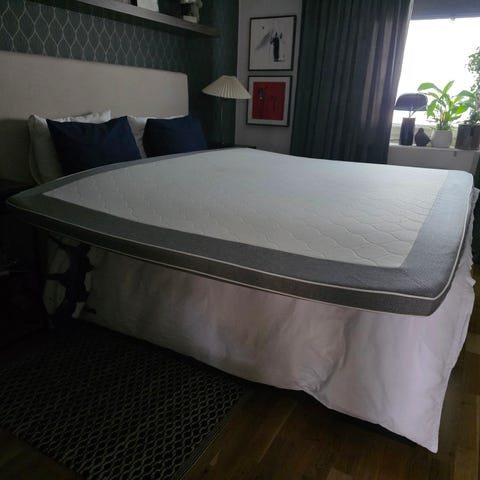 Den tunna övre bäddmadrassen är tvättad i maskin men madrasskyddet har fläckar som inte gått bort. Vi skickar med bäddmadrassen som är ren och fullt fungerande, men vill man kan man köpa en ny för strax under tusenlappen hos Jysk med tanke på fläckarna.