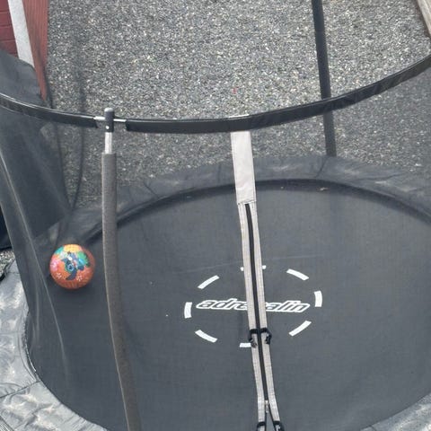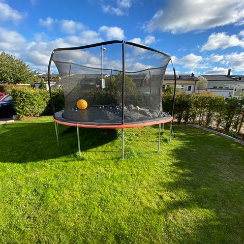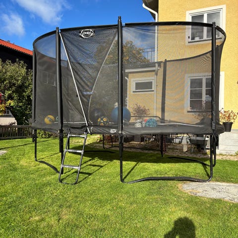 Det är i bra skick med skyddsnät och ingång som stängs med dragkedja. Det är nedmonterat så det är bara att hämta. Diameter 244cm.