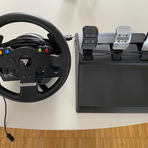 Thrustmaster TMX racerratt med tillhörande pedalset med tre pedaler. Ratten har flera knappar och styrkors för spelkontroll samt anslutningskabel. Pedalstället har gas-, broms- och kopplingspedal med metallplattor och justerbara fästen. Passar för bilspel och racingsimulatorer på kompatibla spelkonsoler och PC, beroende på systemstöd och anslutningar.