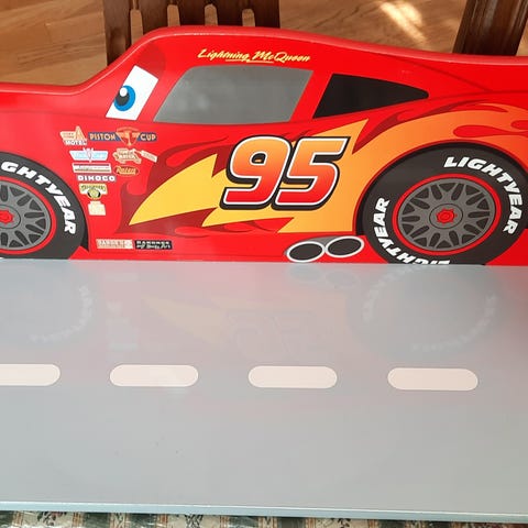 Grå/röd leksakshylla i trä med hängare från Lilla Snigel Leksaksaffär i Norrköping. Oanvänd.