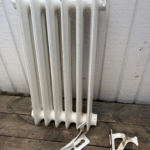 Element radiator i vit färg med termostatventil. Vattenburet värmeelement med anslutningar och fästen enligt bild. Passar för montering i bostad eller garage som del av befintligt värmesystem.