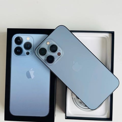 Apple iPhone 13 Pro Max mobiltelefon med lagringskapacitet på 256 GB i färgen guld. Modellen har trippelkamera på baksidan, stor skärm på framsidan och platt ramdesign i metall. På bilderna syns originalkartong, usb‑kabel och ett genomskinligt skal. Passar för användning med appar, surf, foto och video samt lagring av filer, bilder och media.