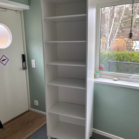 2 lådor i botten, 1 glashylla, 1 plåthylla och övriga standardhyllor. 2st glas/vitrindörrar. Obs, De 2st cremefärgade lådorna ingår inte!