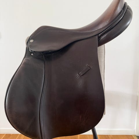 Sadel i svart läder. Traditionell engelsk modell med djup sits och knästöd. Passar för ridning och träning. Sadelns exakta storlek och modell är okänd utifrån tillgänglig information.