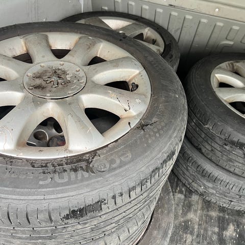 Godkända sommardäck på lättmetallfälgar. 4 bulthål, suttit på Peugeot 206 SW.
