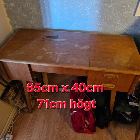 Ett litet nätt sminkbord, passar ett trångt utrymme eller ett flickrum, spegel som går att vinkla, tre små lådor, lite skavmärken men ok att använda eller måla om, helt i trä, går att montera bort ben och spegel för transport, mått 70 högt, 78 bredd o 32 djup, finns i Simlångsdalen