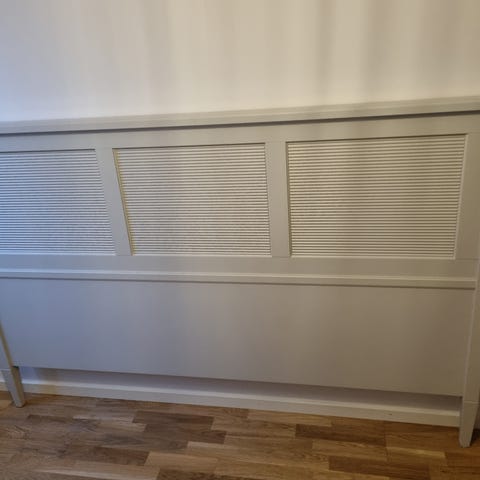 Höjd 105 cm, Bredd 240 cm, Djup 24,5 cm. Hyllor står ut 18,5 cm från möbeln. Passar säng 160 - 180 cm. Hämtas i Gammelstad.