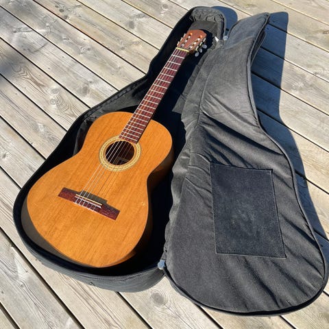 Bjärton akustisk gitarr i naturträutförande. Klassisk modell med nylonsträngar och traditionell huvudform. Ljus träfärg på lock och mörkare trä på baksida och sarg. Gitarren är helakustisk och passar för exempelvis klassiskt spel, visor och ackompanjemang. Kropp och hals är i trä med greppbräda och stall i mörk träslagston. Lämplig för hemmabruk, övning och enklare framträdanden.