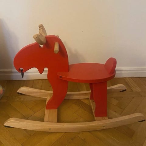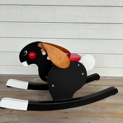 Gunghäst i trä med naturfärgad finish. Klassisk modell med ryggstöd och bygel runt sitsen för extra stabilitet för mindre barn. Hästens sidor är målade med dekorativa mönster i svart och rött. Träet är märkt med FSC-certifiering och leksaken är CE-märkt. Passar som inredningsdetalj i barnrum och som leksak för gunglek inomhus.