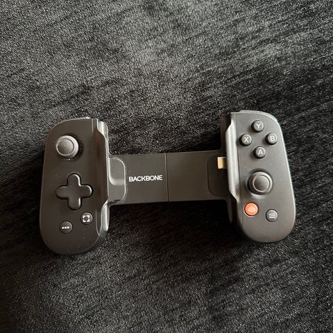 Backbone One PlayStation handkontroll i vit färg för mobilspel. Kontrollen är utformad för att användas med iPhone och Android-telefoner och har två analoga styrspakar, riktningsknappar, axelknappar samt funktionsknappar i PlayStation-stil. En justerbar hållare i mitten gör att telefonen kan fästas mellan handtagen för spel direkt på mobilen.