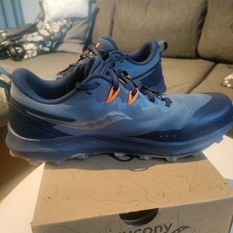 Saucony Peregrine 16 löparskor i storlek 39. Skorna är avsedda för löpning och har en svart färg med ljusa detaljer. Modellen är konstruerad för att ge grepp och stabilitet vid löpning, med en ovandel som ger stöd runt foten och en sula anpassad för löpning på varierat underlag.