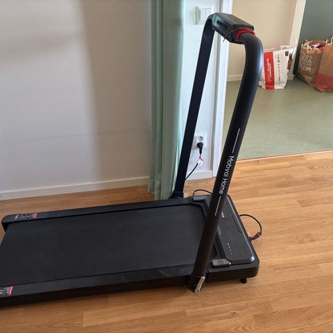 Löpband med hopfällbar konstruktion för användning inomhus. Utrustat med räcke och hållare framtill, samt elanslutning via vägguttag. Gång- och löpytan är rak och maskinen kan fällas ned för platsbesparande förvaring när den inte används. Passar för enklare träning och motion i hemmet.