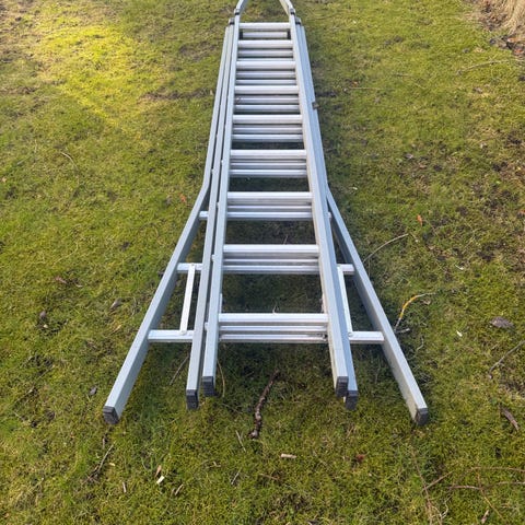 Stålstege. Inget hittepå utan stabil och rejäl. Fungerat som loftstege de senaste 20 åren.