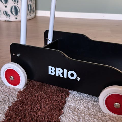 gåvagn i trä med aktivitetsbräda på framsidan. Vagnen är rosa med vita och färgglada detaljer. På framsidan finns flera olika aktivitetsleksaker, bland annat snurrhjul, kugghjul, kulbana, räknestavar och roterande klossar. Baksidan är öppen med handtag upptill och fyra hjul nertill. Lämplig som stöd vid barnets första steg och som aktivitetsleksak för mindre barn inomhus.