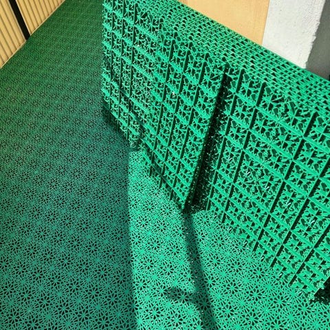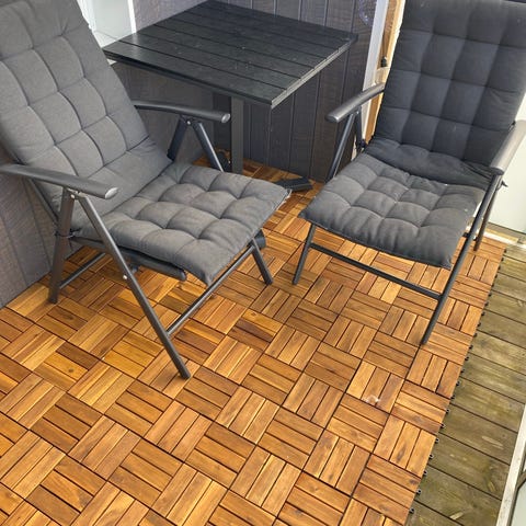 Trallplattor för balkong eller uteplats. Plattorna läggs kant i kant för att skapa ett jämnt golv ovanpå befintligt underlag, exempelvis betong eller plåt. Passar för användning utomhus på balkong, altan eller terrass.
