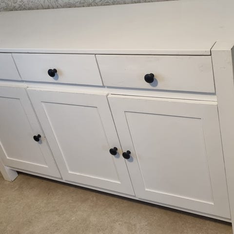 Fin skänk i svart. I bra begagnat skick. 2 luckor framtill. Hyllplan och en låda inne i skåpet. Är inte målat på insidan.