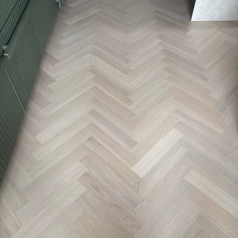Parkett fiskbensgolv i massiv ek med ljus träton. Golvet är lagt i klassiskt fiskbensmönster och passar exempelvis i vardagsrum, hall eller kök. Trägolvet ger en enhetlig yta genom flera rum och kan kombineras med olika typer av inredning och lister. Lämpligt för bostadsutrymmen där man önskar ett trägolv med tydlig struktur och mönster. Har 36m2 i Storlek på ek stavarna 16 x 68 x 340 mm och är i fin kvistfri select sortering ( obs hårdvaxolja kvar till detta ) nypris 1089:-m2 och hårdvaxoljan 3200:-