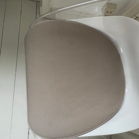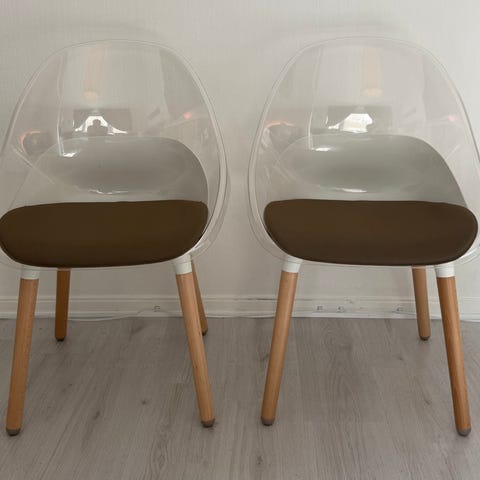Säljer en IKEA BALTSAR stol i transparent plast med brun/sandfärgad sittdyna och vit fot. Stilren design som passar fint vid skrivbord, matbord eller som extra stol i hemmet.