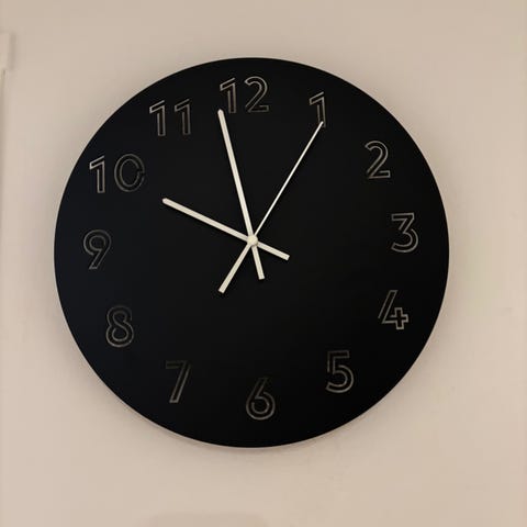 Rund väggklocka med svart urtavla och kromfärgad ram.