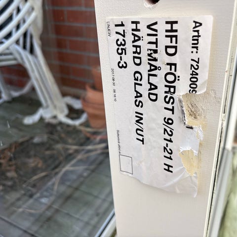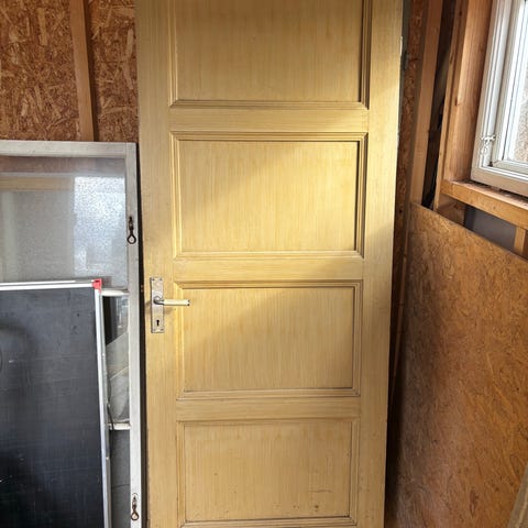 Ytterdörr i trä med brun utsida och naturfärgad insida. Dörren har en överdel med glasruta indelad i fyra fält som släpper in ljus. Passar som ytterdörr till mindre hus, fritidshus eller förråd där man önskar en kombination av insyn och ljusinsläpp. Dörren är utrustad med handtag och låshus på insidan. Karm, yttermått: 79cm.