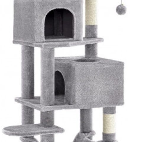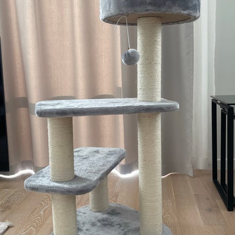 Katträd klösträd i grå plysch med flera nivåer, liggplatser och två kojor. Stolparna är delvis lindade med sisal för klovård. Flera runda avsatser högst upp fungerar som utkiksplatser. Hängande leksaksbollar är fästa under vissa plan. Passar för inomhusbruk till en eller flera katter som behöver klösyta, vila och aktivering.