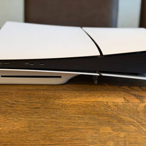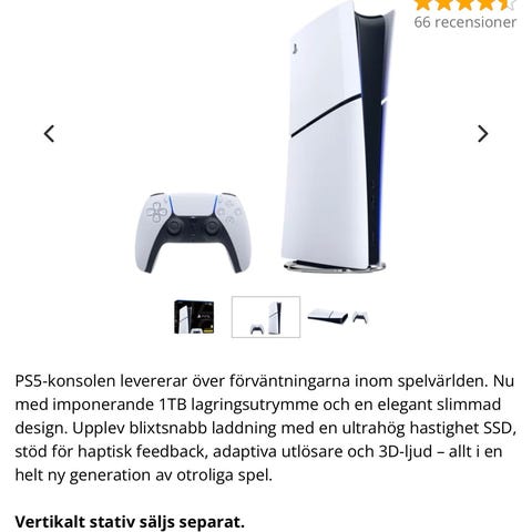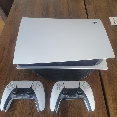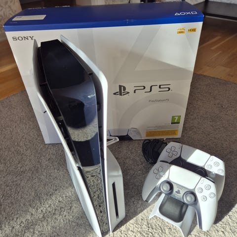 PS5 med skivläsare. Medföljer gör en fungerande handkontroll, en med ”stick drift” (den vinröda), HDMI-kabel och stickpropp.