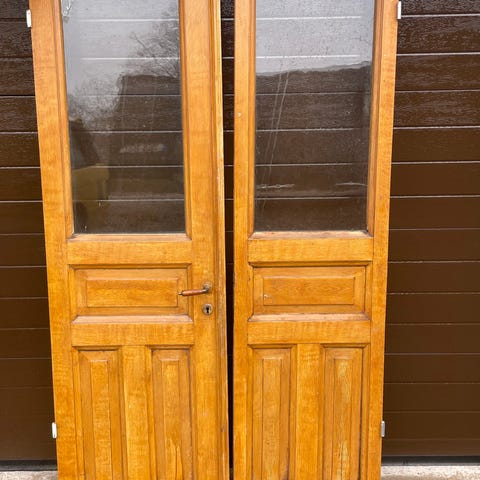 Trädörrar med stora glaspartier och dekorativt mönster. Dörrarna verkar vara innerdörrar med träram och infällda glasrutor. Passar exempelvis till förråd, uterum eller som rumsavdelare där man vill släppa in ljus samtidigt som glaset ger ett dekorativt inslag. Exakta mått, öppningsriktning och typ av låsbeslag behöver kontrolleras vid intresse.