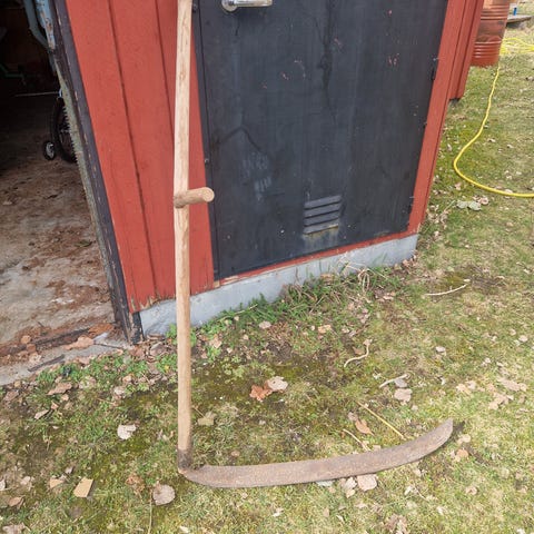 Lie med långt träskaft och böjt skärblad. Handtaget är placerat på skaftet för tvåhandsfattning. Passar för slåtter av gräs och sly eller som traditionellt redskap i trädgård och på mindre marker. Snygga som prydnad också.