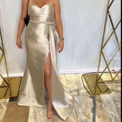Festklänning för dam i beige satin, storlek S. Klänningen är axelbandslös med omlottliknande överdel och markerad midja. Lång, figurnära modell med släp och lätt glansig yta i materialet.