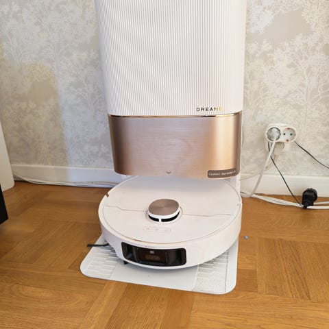 Dreame robotdammsugare med tömningsstation i svart utförande. Robotdammsugaren står i en docknings- och tömningsstation som samlar upp damm från enheten. Passar för automatisk dammsugning av golv i hemmet och kan placeras mot vägg eller i hörn för smidig förvaring när den inte används.