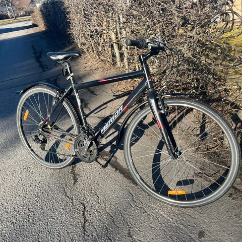 rescent hybridcykel för unisex med ramstorlek XXL och 28" hjul.Cykeln har en svart ram med detaljer i kontrastfärg och är utrustad med raka styren, sadel anpassad för vardagscykling samt reflexer. Passar för pendling och vardagsbruk på både asfalt och enklare grusvägar. Stor ram och hjulstorlek gör den lämplig för längre cyklister som vill ha en upprätt och bekväm sittställning.