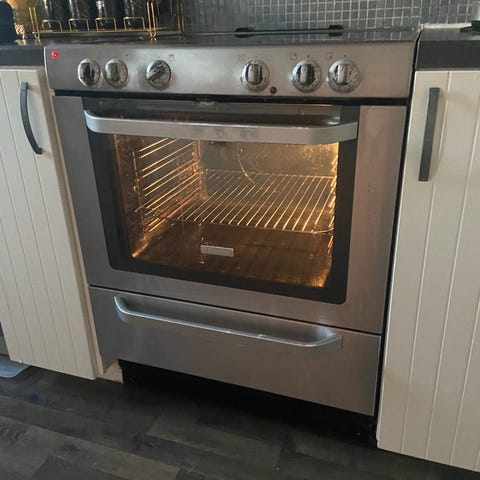 Elektro Helios spis med ugn i vit färg. Spisen har fyra plattor upptill och en ugn med glaslucka framtill. Några vred trasiga.
