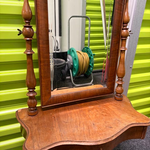 Mio spegel med låda i brunt trä. Spegeln är monterad på en fot med utdragbar låda för förvaring av mindre föremål. Ramen har dekorativa sniderier och spegeln kan vinklas genom sidofästen. Passar exempelvis på byrå, sminkbord eller hallmöbel för spegling och förvaring.