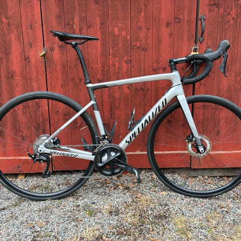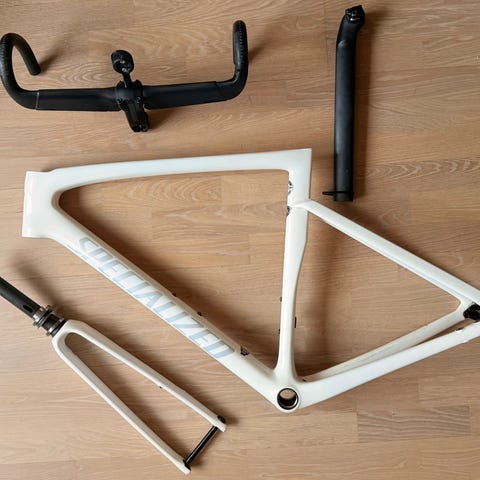 Säljer en fin specialized aethos sport. Storlek 58. Färgen är Gloss Fog Tint Carbon Dune White. Den har rullat ca 200 mil och hälften av dessa på trainer inomhus. Vaxad kedja. Just nu sitter en annan styrstam på än original. original finns och kan monteras vid köp.
