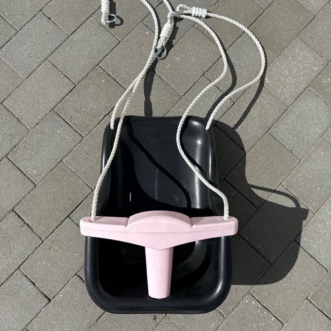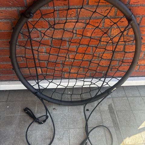 Rund hängstol i svart rep med nätmönstrad sits och rygg. Modellen hängs upp med rep i tak eller annan stabil upphängning. Passar för inomhus- eller uterum beroende på upphängning och materialets tålighet. Sitsen har flätad konstruktion och dekorativa fransar undertill.
