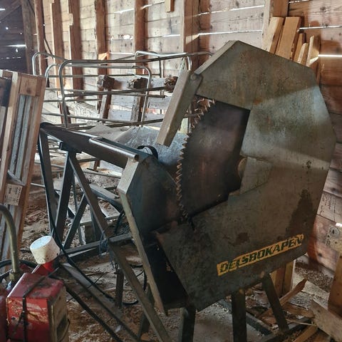 ASEA vedkap med elmotor. Sågen är monterad på stativ med bordsskiva och cirkelsågblad. Lyftbara hjul för transport. Elmotorn är en ASEA trefasmotor enligt typskylten. Utrustningen är fungerande och avsedd för sågning av trä och liknande material i verkstad, garage eller lantbruksmiljö.