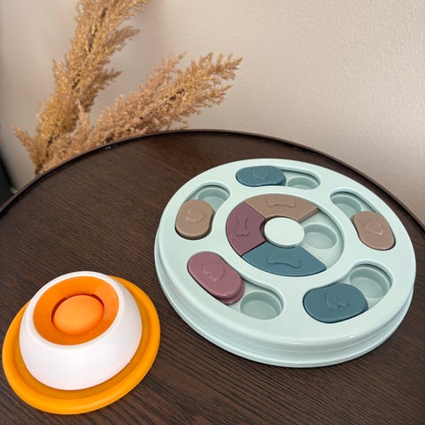 Hundpussel med flera roterande nivåer och små fack för godis eller torrfoder. Utformad för mental stimulans och problemlösning genom att hunden behöver flytta delarna för att komma åt innehållet.