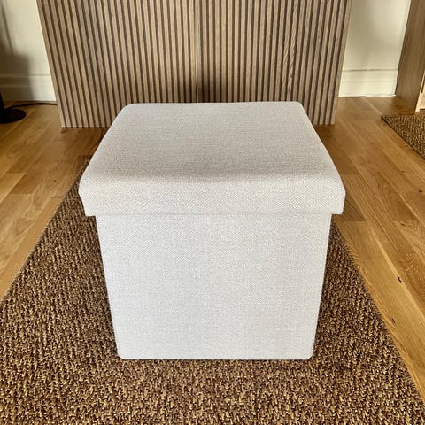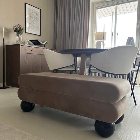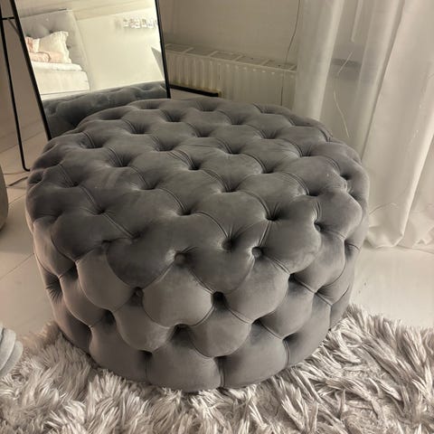 Jotex rund sittpuff i grå sammet. Puffen har djuphäftad knapptuftning på ovansida och sidor, vilket ger en mjuk och stoppad yta att sitta eller vila fötterna på.