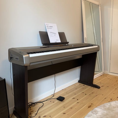 Casio Privia PX-110 digitalpiano med 88 viktade tangenter. Pianot står i ett brunt stativ med notställ och separat sustainpedal. Modellen har inbyggda högtalare och olika anslutningar på sidan för exempelvis hörlurar och externa enheter. Passar för hemmabruk, övning och musikstudier.