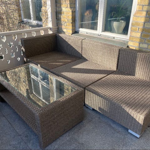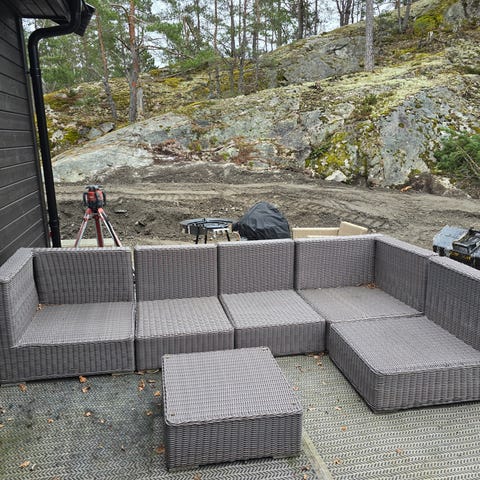 Loungset från Mio möbler ! Otroligt fint skick . Alltid förvarats inomhus under vintern . Dynorna är dessvärre solblekta en aning och kan behöva en tvätt om man vill ha dom med . Avtagbart tyg . Divan delen går att göra till sidopall om man vill .