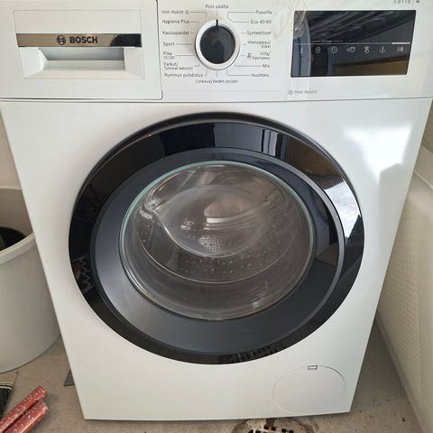 Bosch WAN2807SN frontmatad tvättmaskin i vit färg. Modellen har energimärkning enligt EU-klassning och är avsedd för hushållsbruk. Frontmatad konstruktion med glaslucka och programväljare på frontpanelen. Passar för installation i badrum, tvättstuga eller annat utrymme med vatten- och avloppsanslutning. Tvättmaskinen har flera programval och inställningar för olika textiltyper och tvättmängder.