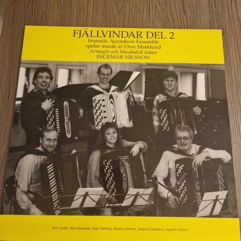 Signerad Roland Cedermark vinylskiva. Omslag med röd kant och foto på artisten med dragspel på fram- och baksida. Passar för uppspelning på skivspelare som stödjer vinylformatet.