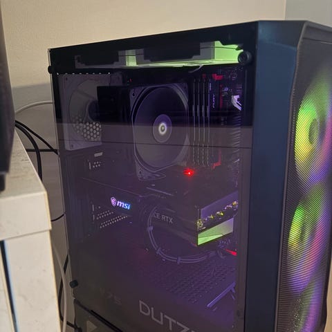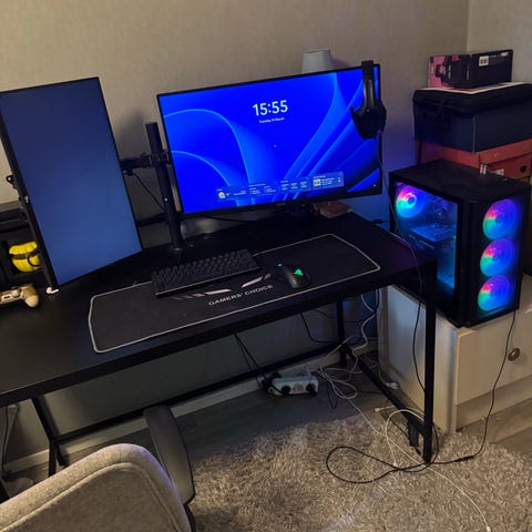 RGB Hyper X tangentbord, en HyperX-mus och ett HyperX-headset stol och bord.