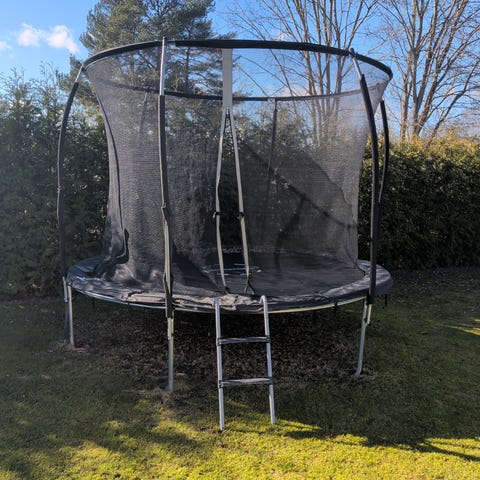 Rektangulär studsmatta för utomhusbruk. Studsmattan står på benställning ovan mark och har svart hoppduk och svart ram. En stege ingår för enklare åtkomst. Passar för montering i trädgård eller på annan plan gräsyta eller liknande underlag.
